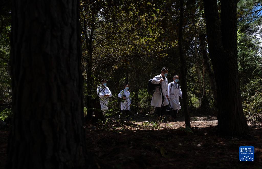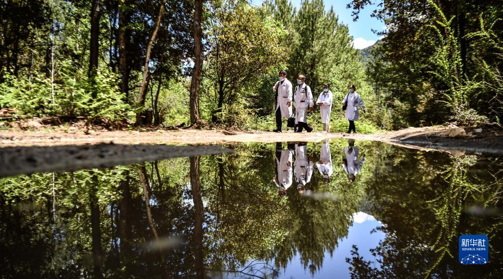 6月12日,王振疆(右一)、王彤旭(右二)、陳冰(右三)和尼瑪益西在樹林間行走。新華社記者 費茂華 攝