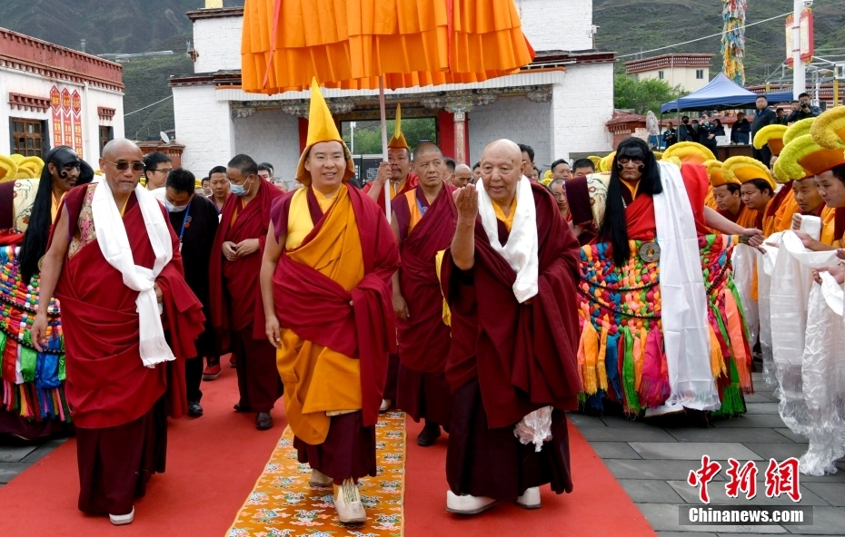 6月12日,全國政協(xié)常委、中國佛教協(xié)會副會長、中國佛協(xié)西藏分會會長班禪額爾德尼·確吉杰布在西藏昌都市強(qiáng)巴林寺禮佛講經(jīng),并為3.6萬余名信眾摸頂賜福。強(qiáng)巴林寺僧眾組成儀仗隊(duì)、焚香、吹響法號,高舉寶傘等,以藏傳佛教最高禮儀迎接班禪。強(qiáng)巴林寺為藏傳佛教格魯派創(chuàng)始人宗喀巴弟子向森·西繞桑布創(chuàng)建于15世紀(jì),因寺內(nèi)主供強(qiáng)巴(彌勒)佛而得名。圖為6月12日,班禪抵達(dá)西藏昌都市強(qiáng)巴林寺,僧眾組成儀仗隊(duì)、焚香、吹響法號,高舉寶傘等,以藏傳佛教最高禮儀迎接班禪。