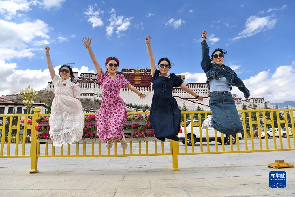 游客在布達(dá)拉宮廣場上合影留念(6月15日攝)。新華社記者 張汝鋒 攝