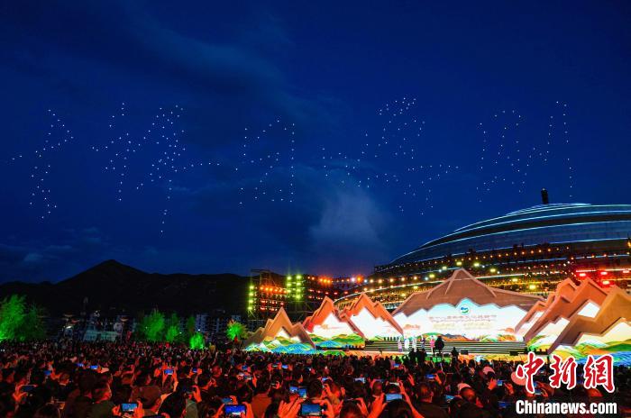 開幕式上,由300架無(wú)人機(jī)組成的暖場(chǎng)表演在日喀則珠峰文化旅游創(chuàng)意產(chǎn)業(yè)園區(qū)上空精彩呈現(xiàn),組成“珠峰故里、吉祥日喀則,歡迎您!”等陣型。匠心獨(dú)運(yùn)的創(chuàng)意設(shè)計(jì),流光溢彩的聲光電效果,以恢弘氣勢(shì)和華麗造型,展示日喀則的開放包容。文藝表演由序《珠峰頌歌》、上篇《戀上青稞》、下篇《極境暢想》和尾聲《吉祥日喀則》組成。聲,是情的流露;舞,是意的表達(dá)。文藝演出將民眾的生活與藝術(shù)相結(jié)合,融合傳統(tǒng)文化與現(xiàn)代歌舞等藝術(shù)形式,既富有傳統(tǒng)特色又極具時(shí)代魅力,將日喀則各族人民的喜悅和游情盡情抒發(fā),充分表達(dá)了日喀則各族人民對(duì)美好生活的熱愛和對(duì)祖國(guó)的祝福歌頌。