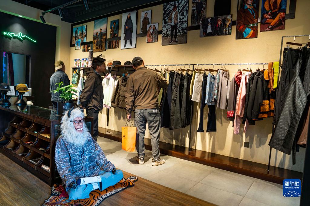 在拉薩一家以“雪怪”為主題的藏式時(shí)裝店,顧客們選購(gòu)商品(6月18日攝)。新華社記者 孫非 攝