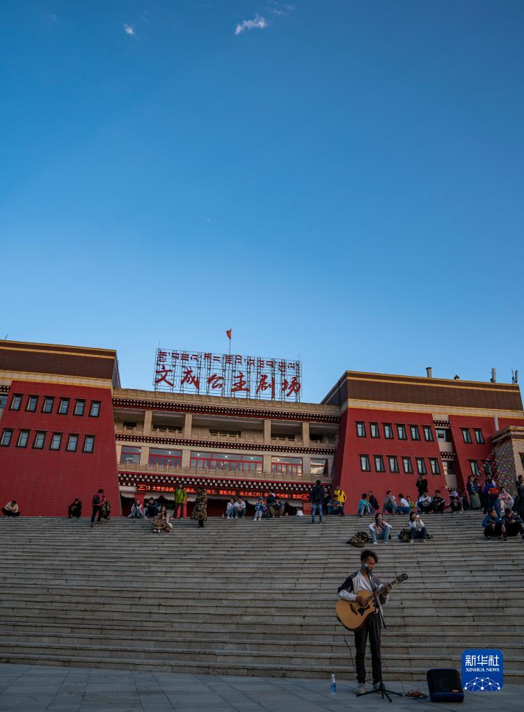 在文成公主劇場(chǎng)前,一名街頭藝人表演吉他彈唱(6月6日攝)。新華社記者 孫非 攝