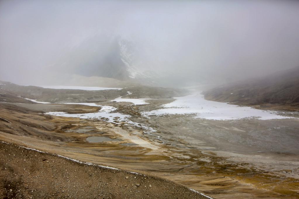 如果說札達土林和古格王國遺址給人的印象可以用宏偉壯觀來形容的話,那么雅魯藏布江發(fā)源地——杰瑪央宗冰川給人帶來的則是蕭瑟與遼闊的景象。我們趕到杰瑪央宗冰川的時候風(fēng)雪交加。凜冽的寒風(fēng)呼呼地刮在臉上像刀割一樣,風(fēng)吹得人幾乎睜不開眼睛。作為本次報道的視頻記者之一,我當時最擔(dān)心的是機器拿不穩(wěn),拍攝畫面出現(xiàn)抖動的情況,所以拍攝全程我都把手中的相機攥得很緊。