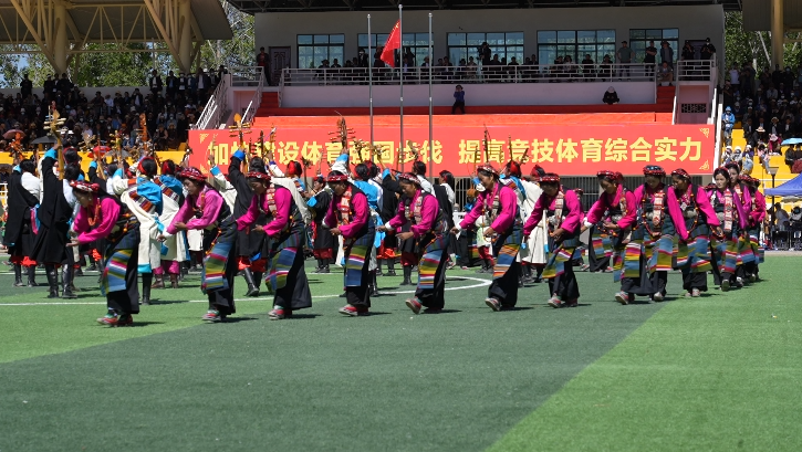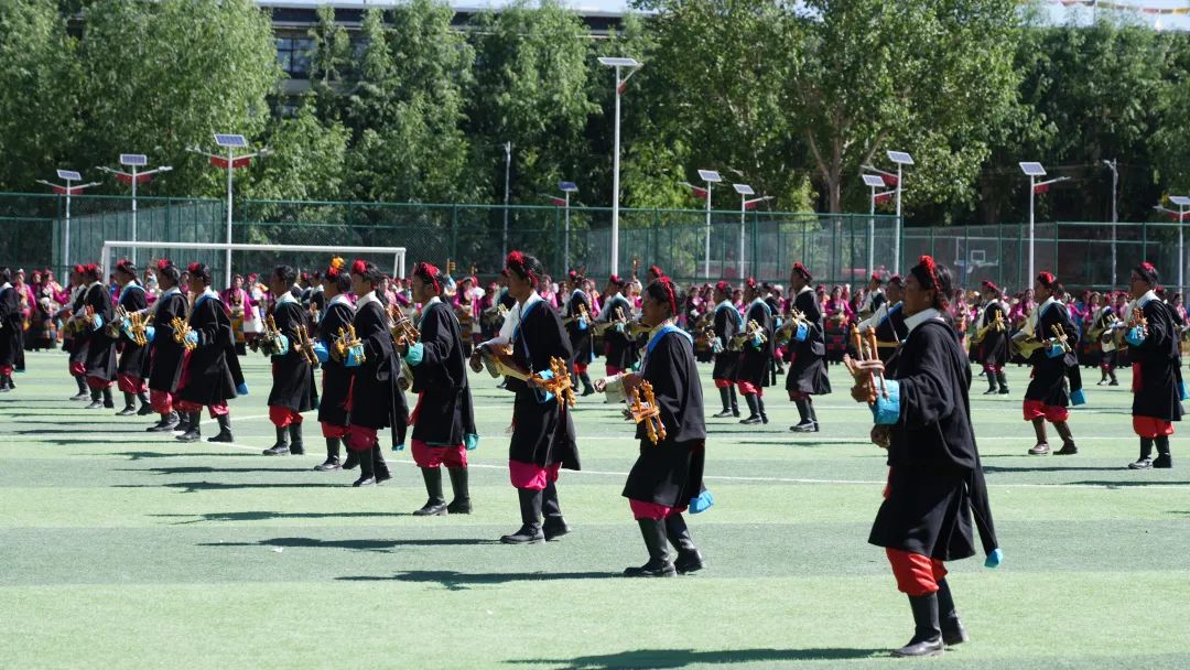 伴隨場上一陣強勁有力的鼓點響起,來自各縣的演員身著節(jié)日盛裝,堆諧、洛諧、司馬卓等民間歌舞風(fēng)格獨特、歷久彌新,在幾層大半圓橫排式的流動陣型中慢慢變換成太陽、月亮、滿天星等陣型。