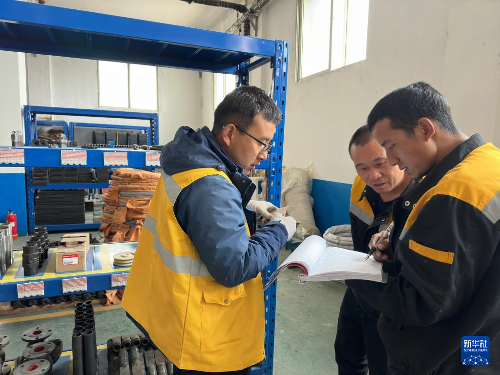 高錢勝(左一)和同事在材料庫(kù)核對(duì)應(yīng)急搶險(xiǎn)備品。受訪者供圖