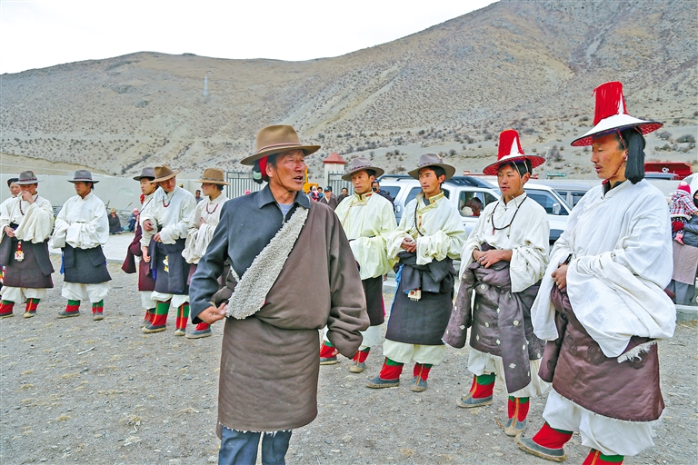 “小時(shí)候,我看見(jiàn)大人們?cè)诓莸厣咸疅嵴袂俊?,舞姿太漂亮了。我不想我的后代只能在書本里看到這個(gè)舞蹈,希望把它傳承下去。”56歲的宗巴為了恢復(fù)“熱振曲卓”表演,于2015年成立了林周“熱振曲卓”傳播有限公司,致力于該舞蹈的傳承保護(hù)。