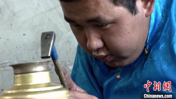 圖為扎西吉彩匠人打制暖壺。貢桑拉姆 攝