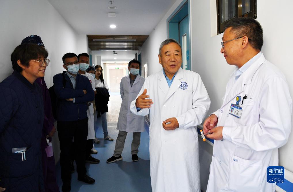 8月10日,中國(guó)科學(xué)院院士、首都醫(yī)科大學(xué)附屬北京天壇醫(yī)院神經(jīng)外科學(xué)中心主任醫(yī)師趙繼宗(右二)和西藏第二人民醫(yī)院的醫(yī)生在醫(yī)院病房走廊里交流。新華社記者 張汝鋒 攝