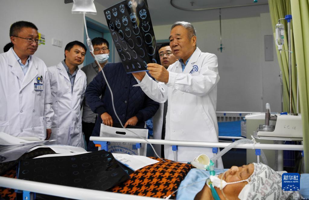 8月10日,中國(guó)科學(xué)院院士、首都醫(yī)科大學(xué)附屬北京天壇醫(yī)院神經(jīng)外科學(xué)中心主任醫(yī)師趙繼宗(左三)和北京天壇醫(yī)院神經(jīng)外科學(xué)中心主任醫(yī)師仇漢誠(chéng)(左二)進(jìn)行教學(xué)查房。新華社記者 張汝鋒 攝