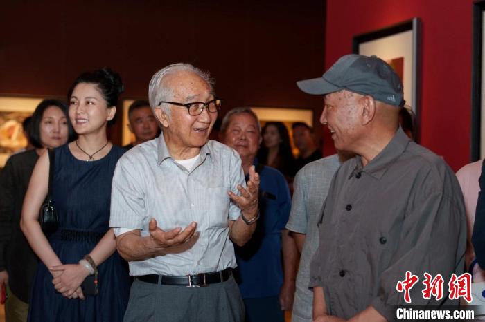 “藏色——巴瑪扎西畫展”亮相中國(guó)美術(shù)館,圖為中國(guó)美術(shù)家協(xié)會(huì)名譽(yù)主席、著名畫家靳尚誼(前排左一)與藏族畫家巴瑪扎西(右一)交流?!“椴匚幕﹫D