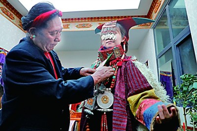 眾多的藝術(shù)形式當然也會催生出絢爛多彩、雍容華貴的普蘭服飾,其中最有名的當數(shù)普蘭“宣”服(又稱飛天服),單是穿戴這套服飾就要用一個多小時。地處貿(mào)易要道的普蘭人,將遙遠的珊瑚、黃金、蜜蠟、白銀、綠松石、珍珠全都裝飾在“宣”服上,展示著對這襲錦袍的無比珍視。家族世代傳承“宣”服制作技藝的才旺多吉現(xiàn)在不僅把技藝公開傳授,每年單靠制作“宣”服,純收入就能達到四五萬元,而且通過普蘭的邊貿(mào)市場,這些服飾還能賣到尼泊爾和印度。