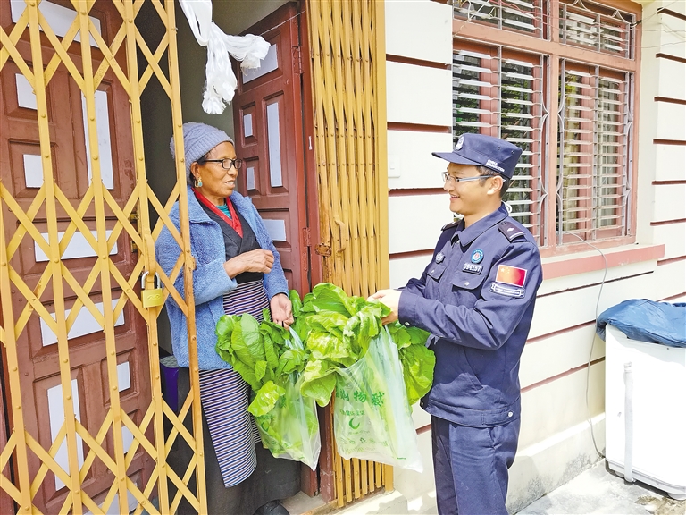 立新邊境派出所民警文昌太給轄區(qū)孤寡老人送去自己種的蔬菜。 圖片由日喀則邊境管理支隊(duì)提供
