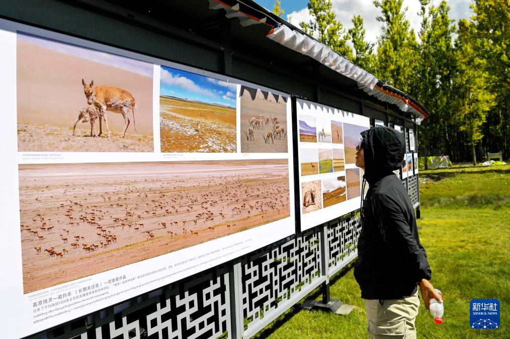 在拉薩市林周縣邊交林鄉(xiāng)當杰村,觀眾在欣賞第十六屆西藏珠穆朗瑪攝影大展作品(9月8日攝)。新華社記者 張汝鋒 攝