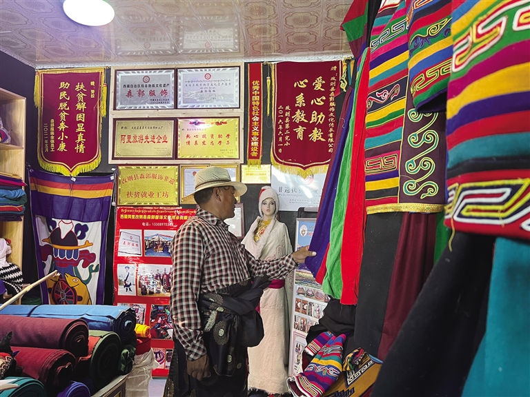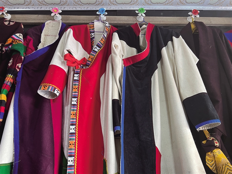 努拉今年66歲,自他曾祖父起,家人就開始從事“森郭服飾”制作,并將這項非遺技藝一代一代傳承了下來。努拉告訴記者:“從父親那一輩開始,由于外來服飾的流入,藏民族傳統(tǒng)服飾的發(fā)展就不如從前了,這對‘森郭服飾’的傳承也有很大的影響。”