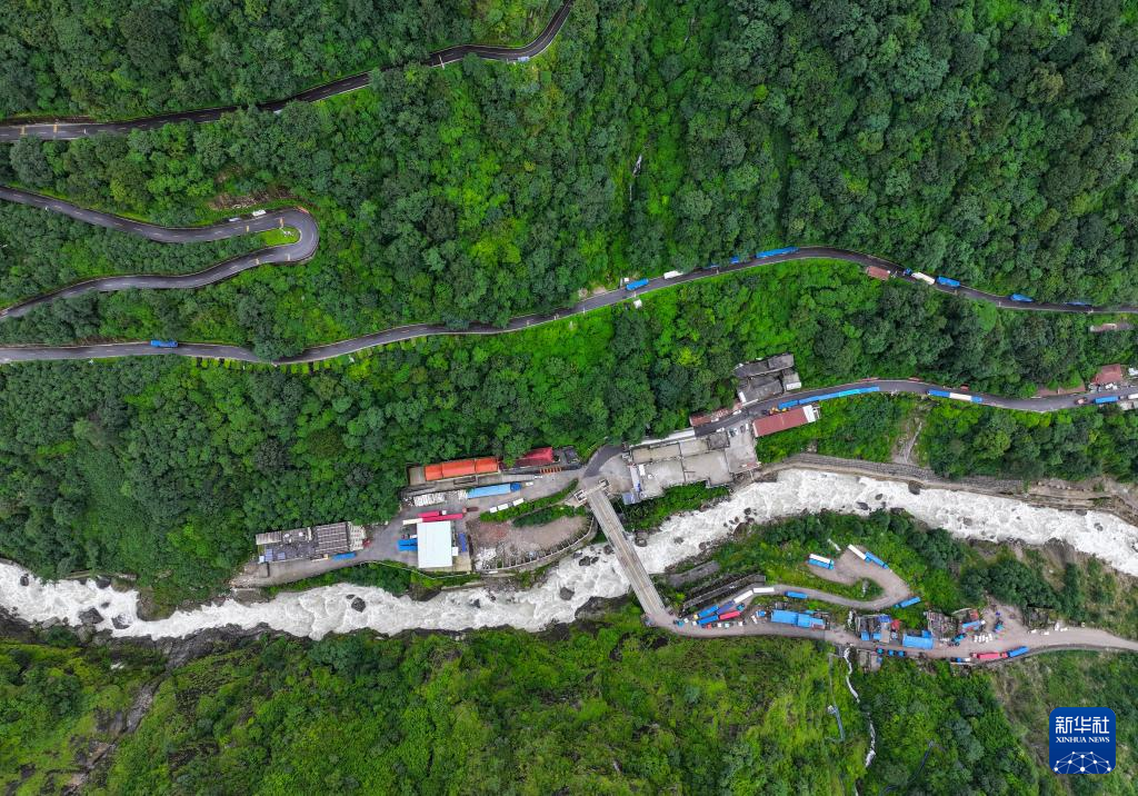 俯瞰樟木口岸的中尼友誼橋和通向樟木鎮(zhèn)的盤山公路(無人機照片,9月9日攝)。新華社記者 姜帆 攝