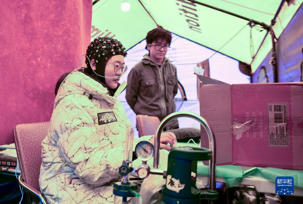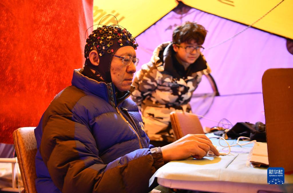 在卓奧友峰登山大本營(yíng),中科院院士朱彤佩戴全腦彈性測(cè)試帽,測(cè)試人體認(rèn)知能力(10月1日攝)。新華社記者 晉美多吉 攝