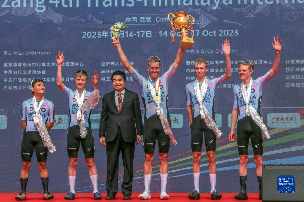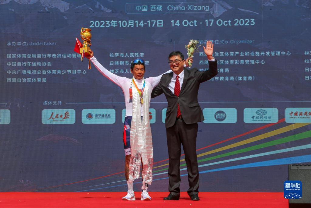 10月17日,李寧之星車隊的車手白利君(左)獲得代表亞洲最佳個人獎的白衫。新華社記者 邵澤東 攝