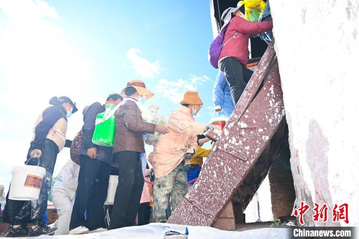 參與到粉刷中的民眾有序運(yùn)送或潑灑涂料???0歲的丹巴渾身沾滿了白色涂料,小憩間盤腿席地而坐,正在喝甜茶的他,還不忘熱情招呼記者品嘗。這位老人原是布達(dá)拉宮的木匠,工作了28年。退休后,每年布達(dá)拉宮粉刷,他幾乎都要來參加,覺得來布達(dá)拉宮像回家一樣親切。他說:“以前都是口頭通知喊大家過來,現(xiàn)在網(wǎng)上一發(fā)消息,大家都主動(dòng)參加?!?/p>