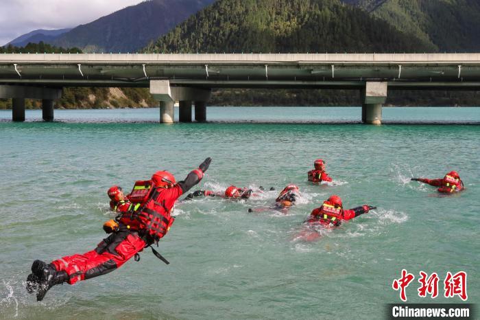 圖為林芝森林消防指戰(zhàn)員在尼洋河進行平跳式入水訓(xùn)練。楊永龍 攝