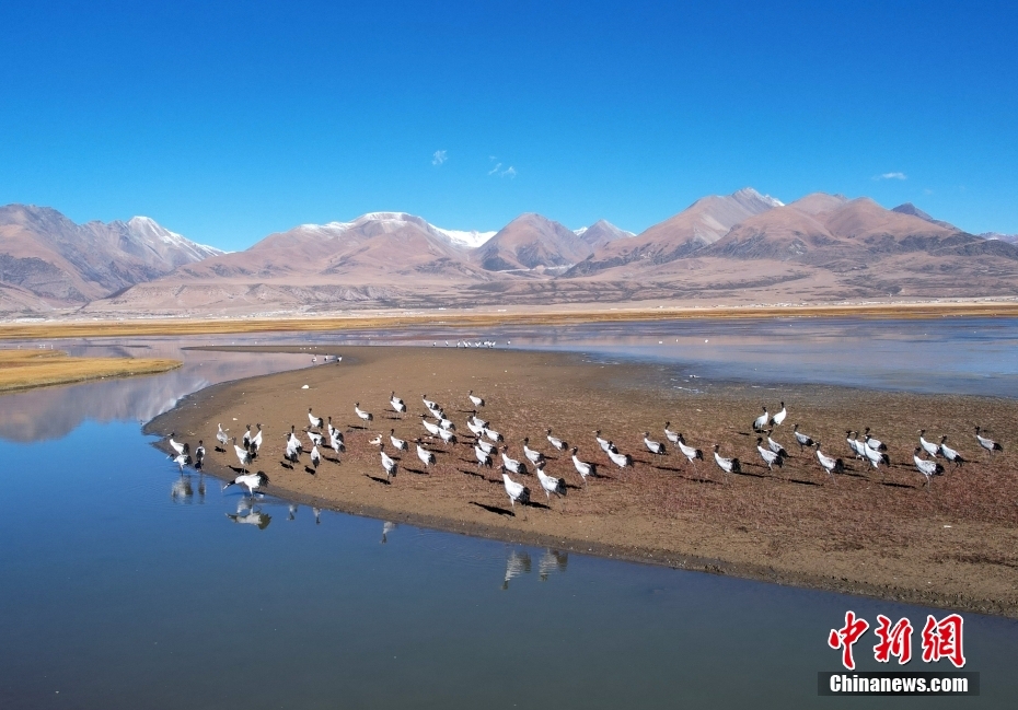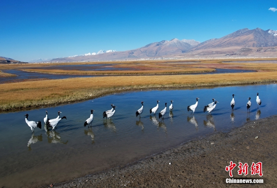 10月23日,成群的黑頸鶴在拉薩市當(dāng)雄縣阿熱濕地內(nèi)覓食。黑頸鶴是全球十五種鶴類中,唯一在高原地區(qū)繁殖和越冬的鶴類,屬中國國家一級保護野生動物。(無人機照片)