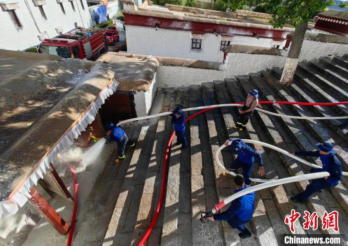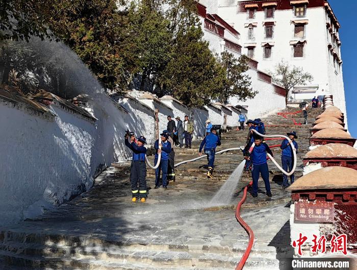 布達拉宮墻體粉刷正式開始前一周,大隊每日清晨、傍晚組織指戰(zhàn)員對布達拉宮山體進行全面濕化,消除火災(zāi)隱患。劉瑜 攝