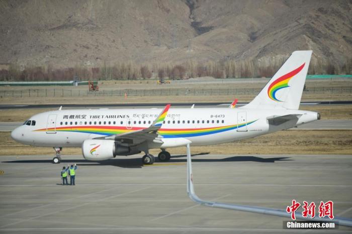 1月7日,一架西藏航空客機在拉薩貢嘎機場準備起飛。當日是2023年春運首日,西藏拉薩貢嘎機場旅客出行井然有序。(中新社記者 貢嘎來松攝)