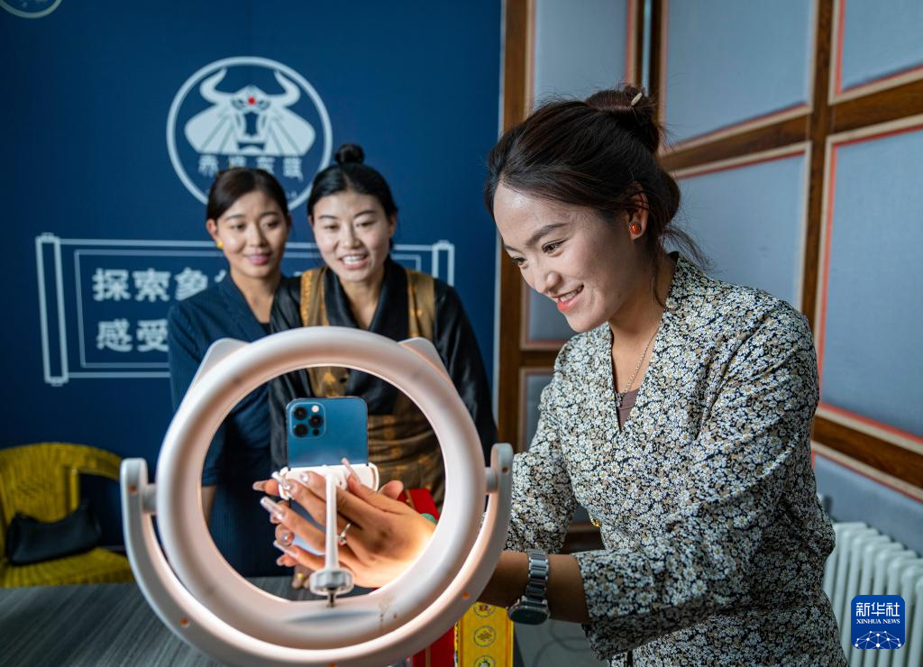 網(wǎng)絡(luò)主播在巴青縣“赤堆東雄”網(wǎng)紅直播間推介當(dāng)?shù)靥厣r(nóng)牧產(chǎn)品(10月29日攝)。新華社記者 孫非 攝