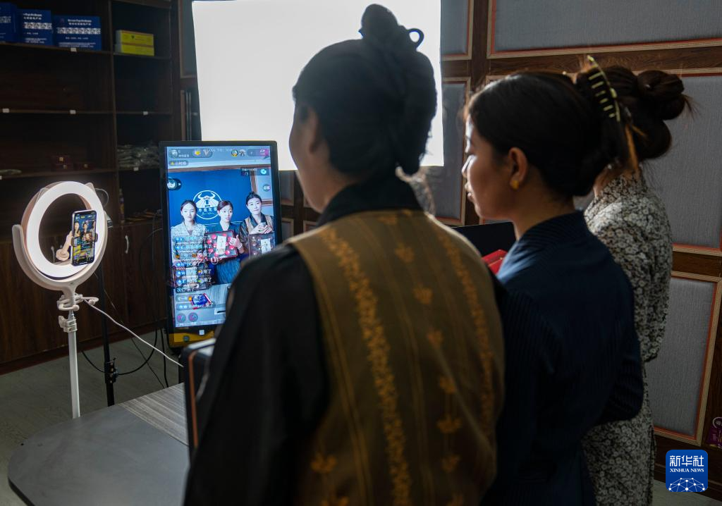 主播朗貢旺姆(右)和普么在巴青縣“赤堆東雄”網(wǎng)紅直播間挑選商品(10月29日攝)。新華社記者 孫非 攝