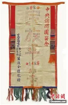 國(guó)家民委主辦的“鑄牢中華民族共同體意識(shí)文物古籍展”正在民族文化宮展出。圖為展覽中展出的新中國(guó)成立后云南省西疇縣第一區(qū)長(zhǎng)箐鄉(xiāng)苗族全體敬獻(xiàn)中央訪問(wèn)團(tuán)的錦旗。民族文化宮供圖