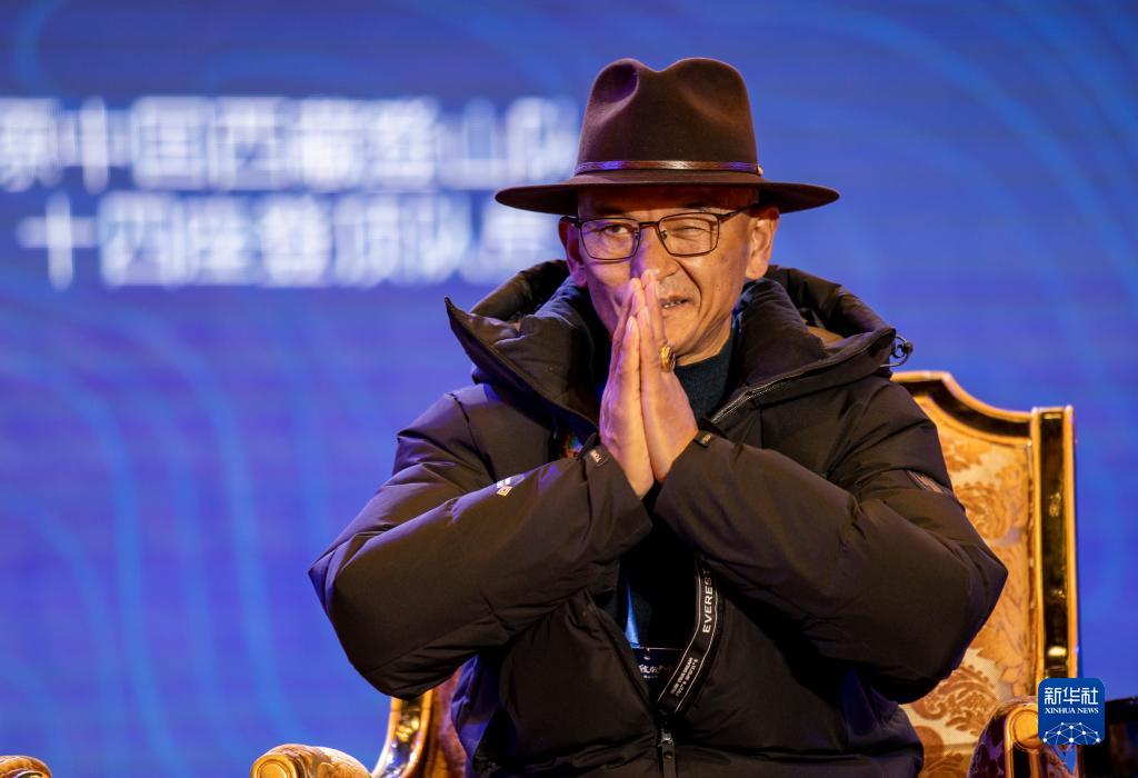 12月11日,原西藏登山隊(duì)登頂世界十四座海拔8000米以上高峰探險隊(duì)隊(duì)長桑珠在交流大會上向觀眾致意。新華社記者 姜帆 攝