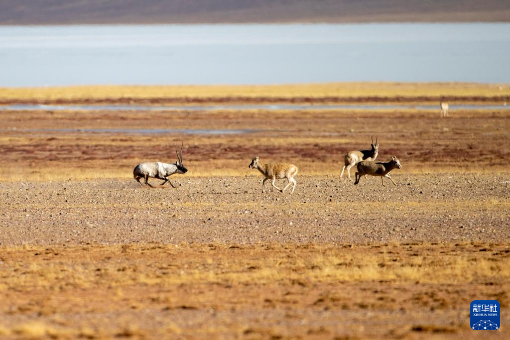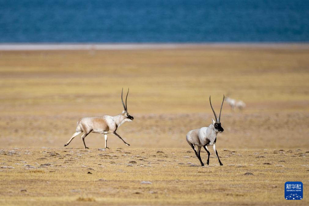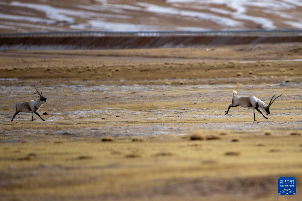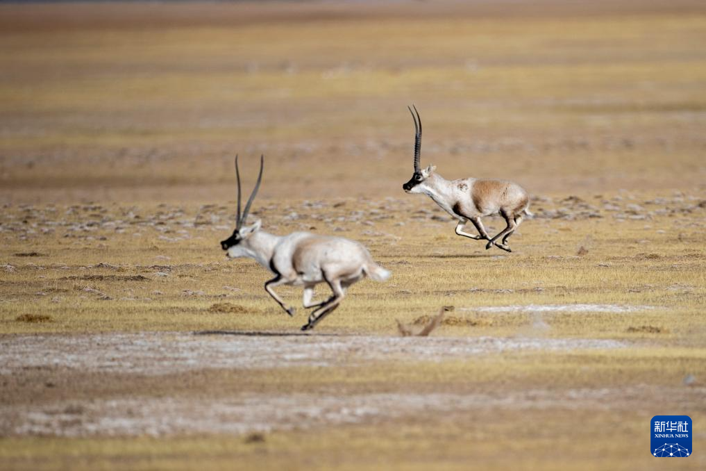 在羌塘國家級自然保護(hù)區(qū),兩只雄性藏羚羊為爭奪交配權(quán)而相互追逐(12月16日攝)。新華社發(fā)(旦增努布 攝)