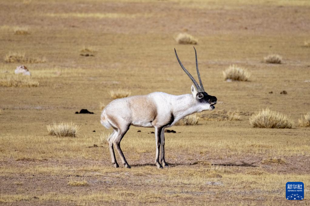 在羌塘國家級自然保護(hù)區(qū),一只發(fā)情的雄性藏羚羊在“呼喚”雌性(12月16日攝)。新華社記者 姜帆 攝