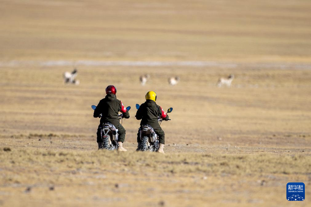 在羌塘國家級自然保護(hù)區(qū),野生動物管護(hù)隊員騎著摩托車觀察藏羚羊(12月17日攝)。新華社記者 姜帆 攝