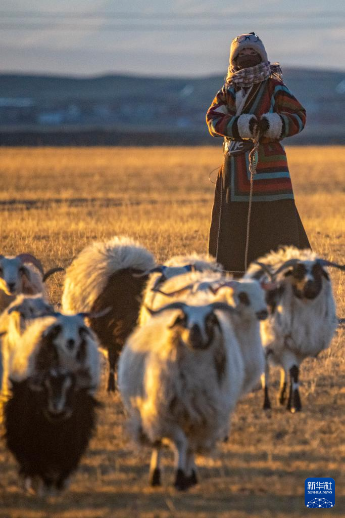 太陽(yáng)落山,丹增家的羊從草場(chǎng)趕回棚圈(12月18日攝)。新華社記者 姜帆 攝