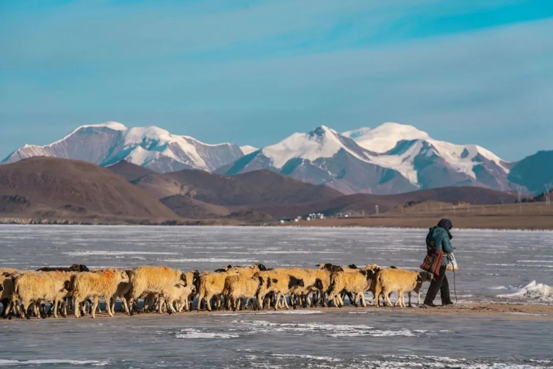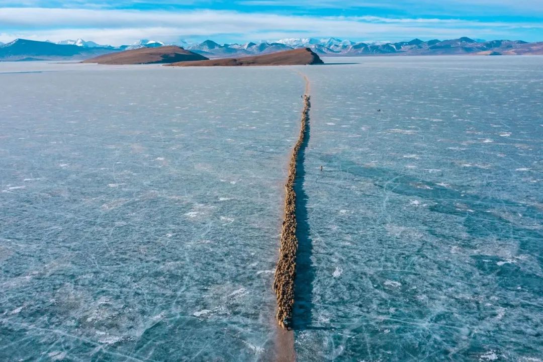它是世界上海拔最高的村落之一,當?shù)卮迕穸家苑拍翞樯:瑏砼R,岸上的牧場草料已經(jīng)不夠羊群過冬,推瓦村的村民們把羊群集結在一起,在冰湖上撒牛糞爐灰,畫出一道冰面上的“羊腸小道”把羊群趕上普姆雍錯湖心島上吃草過冬,雖然只有幾公里的距離,但這個傳承千年的畫面卻給人以史詩般的震撼與感動。
