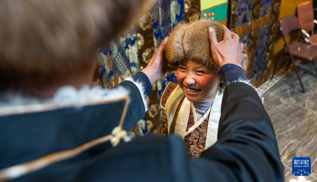 家人為巴桑普尺的孫女益西貴桑佩戴“金花帽”(藏族特色帽子)(1月10日攝)。新華社發(fā)(丁增尼達 攝)