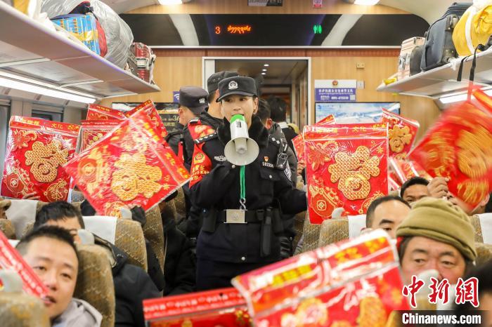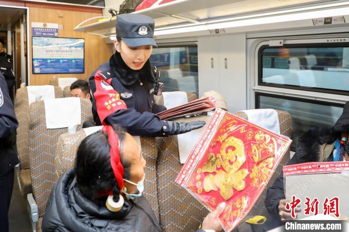 圖為春運(yùn)首日,在拉薩發(fā)往日喀則的C921次列車上,乘警向旅客送上新春的祝福。黃飛 攝