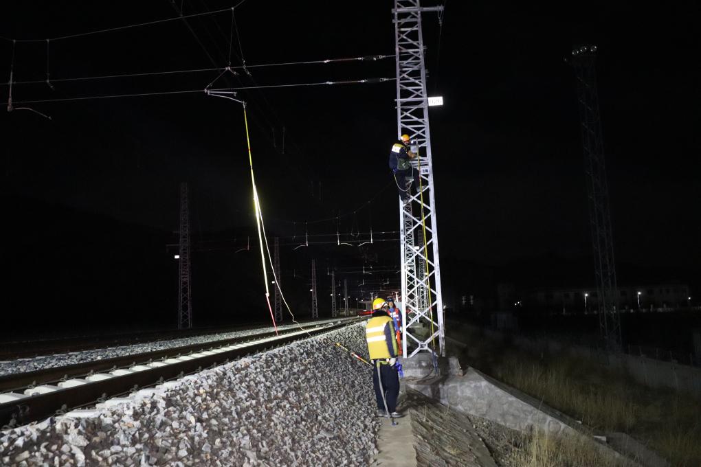 拉薩南接觸網(wǎng)維修隊(duì)工作人員為接觸網(wǎng)接掛地線(1月24日攝)。新華社發(fā)(拉巴次仁 攝)