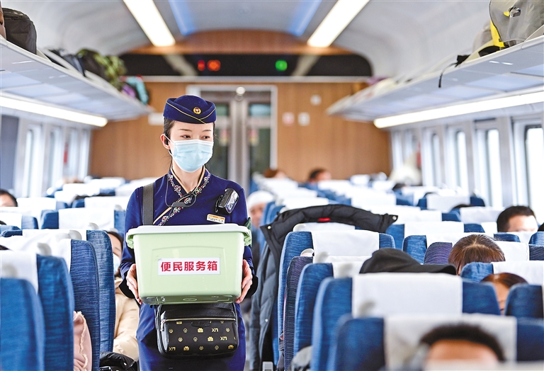 1月30日,中國鐵路青藏集團(tuán)有限公司西寧客運段動車隊乘務(wù)員王璐在為旅客服務(wù)。新華社記者 張龍 攝