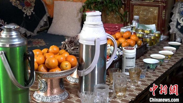 圖為擺放在德慶央宗客廳桌子上的水果、糖果及飲品。貢桑拉姆 攝