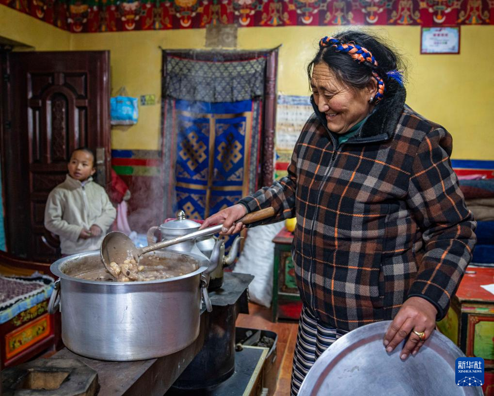 在位于西藏拉薩市當(dāng)雄縣公塘鄉(xiāng)甲根村的家中,斯曲旺姆的兒媳婦朗果在為家人制作“古突”(2月8日攝)。新華社記者 孫非 攝