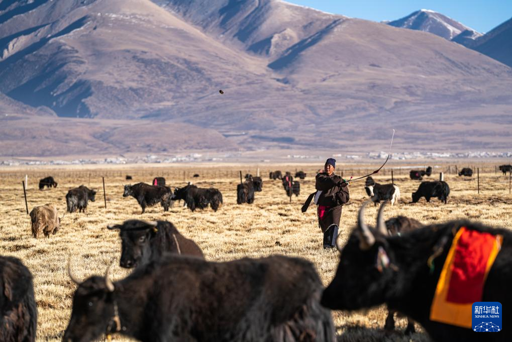 斯曲旺姆的兒子索朗羅達將家里的牦牛趕到牧場上(2月10日攝)。新華社記者 丁增尼達 攝