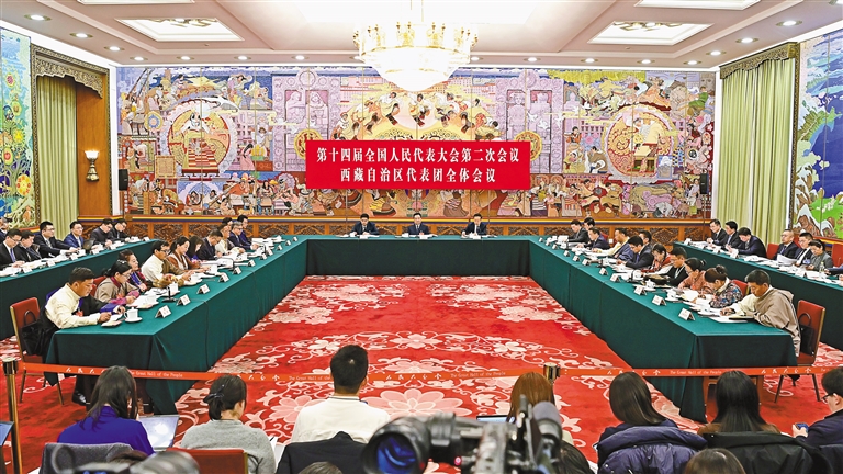 3月6日,西藏代表團舉行全體會議,傳達學習習近平總書記在參加十四屆全國人大二次會議江蘇代表團審議時的重要講話精神,繼續(xù)審議政府工作報告,審查計劃報告和草案、預算報告和草案。