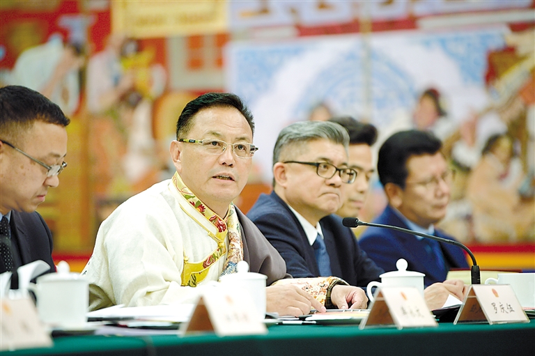 西藏全國人大代表在西藏代表團(tuán)全體會議上發(fā)言。記者 旦增西旦 攝