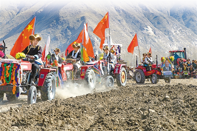 春耕春播儀式是西藏一年之中最隆重的農(nóng)事活動,這一天一定要用“二牛抬杠”犁耕法耕出新年第一犁。儀式上,村民們驅使著自家公牛緊跟拖拉機,在承載著希望的田地上翻出一條條溝壟。隨后,姑娘們?nèi)鱿录挠杳篮米85姆N子,期盼全年風調(diào)雨順、五谷豐登。