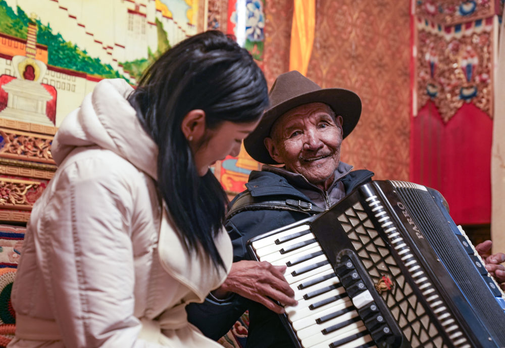 2024年3月14日,嘎東社區(qū)居民朗杰(右)指導(dǎo)孫女索朗曲珍拉手風琴。新華社記者 晉美多吉 攝