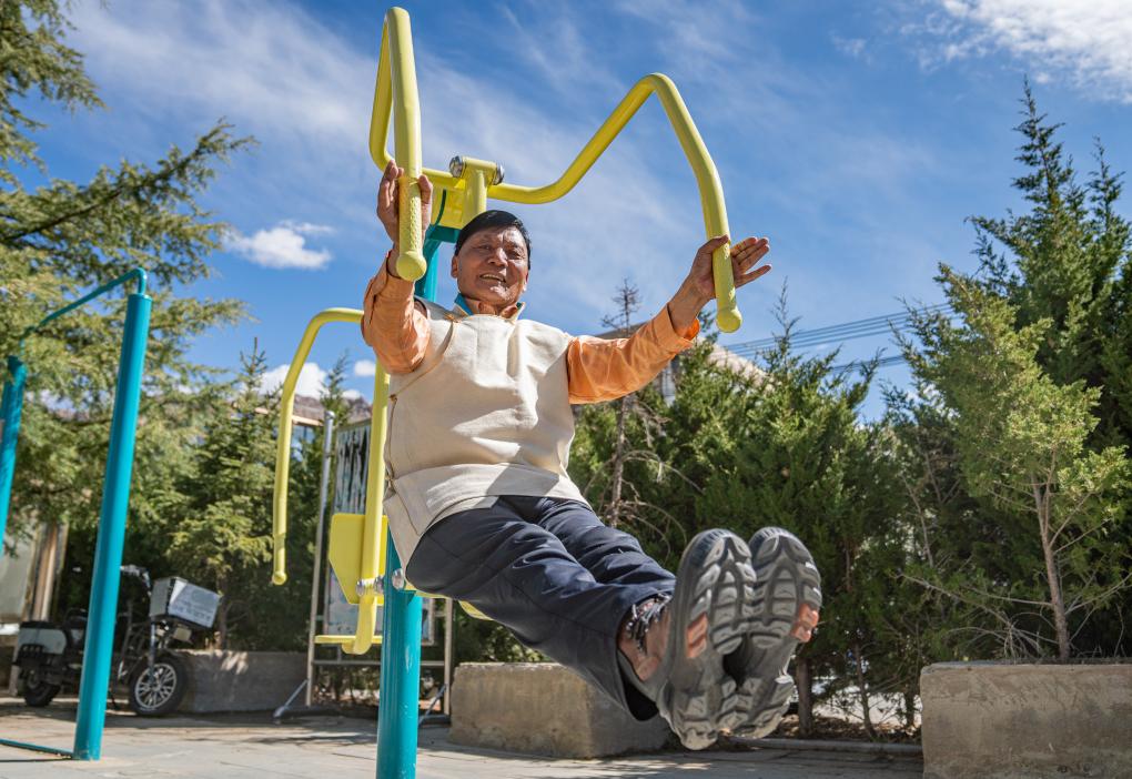 普次仁在小區(qū)健身(3月23日攝)。新華社記者 丁增尼達(dá) 攝