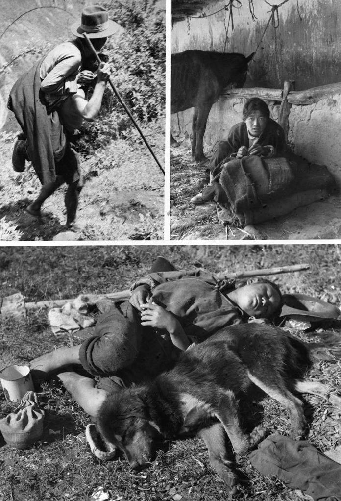 上圖左:西藏農(nóng)奴制度下的“人背人”(即農(nóng)奴背馱農(nóng)奴主)差役。上圖右:和牲口同住的農(nóng)奴。下圖:一位農(nóng)奴服勞役后與犬同眠。(新華社發(fā))
