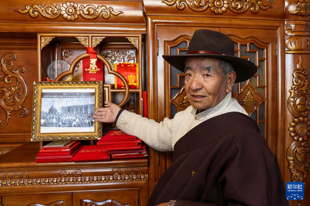 80歲的扎巴旺旦老人展示自己的“光榮在黨50年”紀念章(3月11日攝)。新華社記者 姜帆 攝