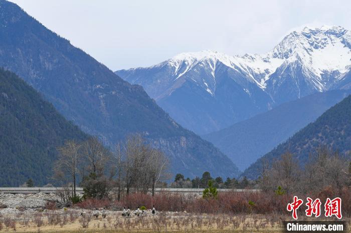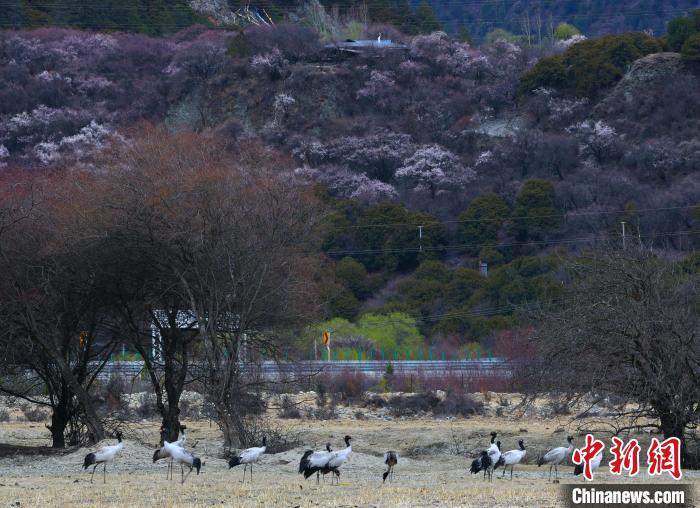 3月30日,在西藏林芝市巴宜區(qū)更章門巴民族鄉(xiāng)境內(nèi),黑頸鶴在村莊里、盛開的桃花前、雪山下翩翩起舞,形成一幅絕美的自然畫卷。黑頸鶴,被譽為“鳥類大熊貓”,是國家一級保護(hù)野生動物,也是世界上唯一在高原地區(qū)生長和繁殖的鶴類。近年來,西藏不斷加大黑頸鶴生存環(huán)境保護(hù)力度。據(jù)2022年冬季越冬黑頸鶴種群數(shù)量調(diào)查顯示,在西藏越冬的黑頸鶴種群數(shù)量達(dá)11175只,種群數(shù)量持續(xù)增長,并在西藏全區(qū)均有分布,其瀕危等級也從“易?!苯禐椤敖!?。在林芝,黑頸鶴在桃花與雪山間自由翱翔,展現(xiàn)了人與自然和諧共處的美好場景。